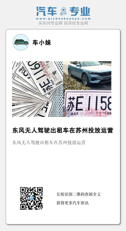 1月18日消息,据东风汽车官方公众号显示,东风悦享科技有限公司在苏州金鸡湖景区投放运营的10辆robotaxi已于日前成功拿到道路测试牌照,标志着2024年苏州首批无人驾驶出租车正式上线。