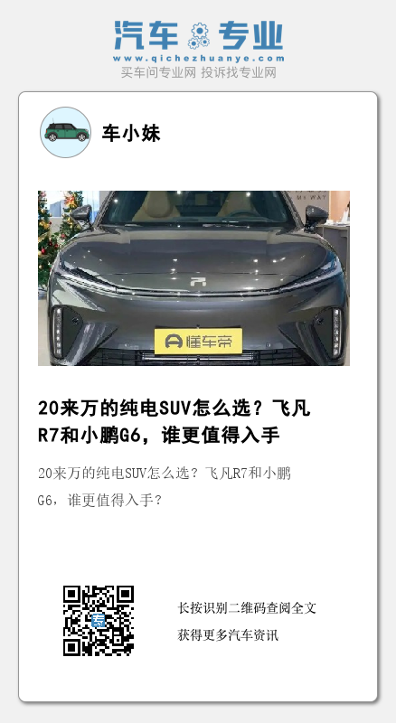 从价格来看,飞凡R7为18.99-22.99万,小鹏G6为20.99-27.69万,后者价格门槛相对较高;从市场表现来看,新款飞凡R7经过129处整车改进后,2023年12月,飞凡R7销量为3099辆,小鹏G6则成为了小鹏品牌销量第一的车型,可见这两款车均获得了市场的高度认可,并具备了强大的市场竞争力。因此,咱们从公平竞争的角度出发,选择官方指导价均为20.99万的两个配置:飞凡R7 2024款 进阶Pro版、小鹏G6 2023款 580长续航Pro,展开比较。