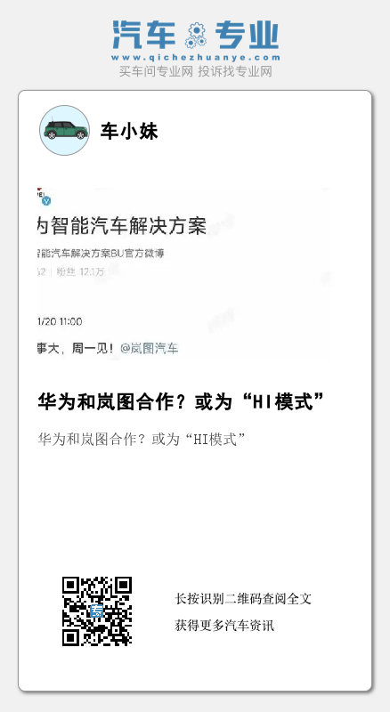 有接近岚图汽车的业内人士透露:“下周一(1月22日)应该只是宣布双方达成战略合作,不会公布具体细节。公司与华为的合作模式或是HI(Huawei Inside)模式。”