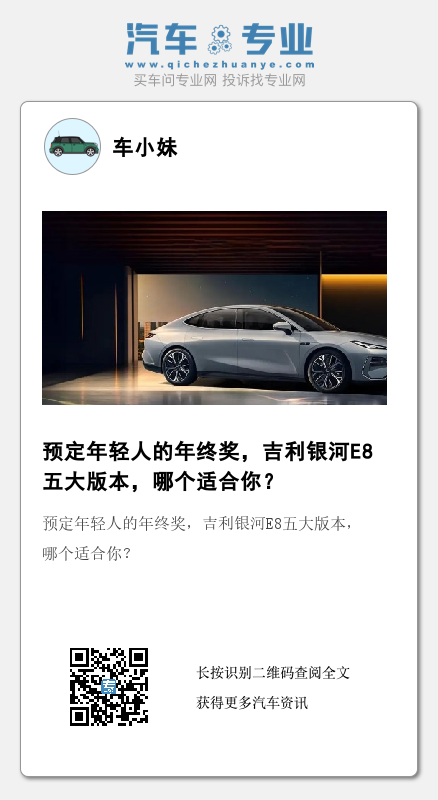 总的来看,银河E8综合优惠下来15万出头就能入手它的入门版,一辆5米车长的达到C级标准的纯电轿车,吉利银河E8性价比还是想当不错的,趁现在购买,开新车回家过年岂不美哉。