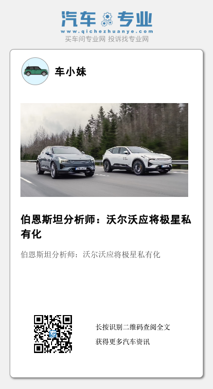 据彭博社报道,伯恩斯坦(Bernstein)分析师称,沃尔沃汽车(Volvo Car AB)及其母公司吉利(Geely)可能需要将极星(Polestar Automotive Holding)私有化。分析师认为,在激烈的竞争中,极星的股价将进一步下跌。