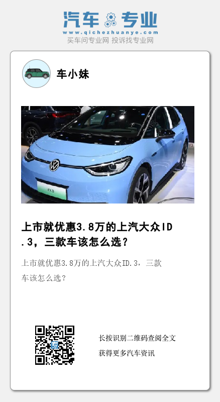 上汽大众ID.3(图片|配置|询价)上市也有段时间了,其实之前就想写篇该车的购车推荐,只是拖到了现在。本次新车推出了三款车型,售价分别是16.3888万、17.1388万和18.0888万,不过上市后新车就优惠3.8万左右,所以价格基本上和23款一样,也就是12.59万、13.34万和14.29万,这也是为什么目前它能月销1万+的原因吧。同时也有很多小伙伴也想入手,只是纠结选哪款,所以今天就来聊聊这款车。