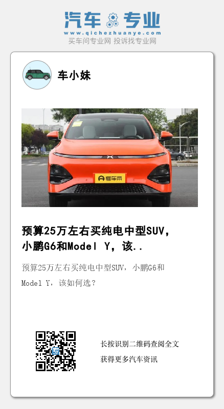 综合来看,通过以上多个方面对比,两者在产品力方面的确有着较大的不同。Model Y在品牌影响力以及市场保有量上,占有较大的优势。但回归到产品本身,小鹏G6在内饰做工用料、智驾配置、安全配置、驾乘舒适性、续航以及充电时间上,的确更有优势一些。此外,小鹏G6还推出了全系限时立减1万元,直接将起售价下探至19.99万,在高速辅助驾驶、前后一体式铝压铸和全域800V高压SiC平台等技术的加持下,性价比更高一些。因此,在同等的预算下,个人认为小鹏G6更值得推荐。