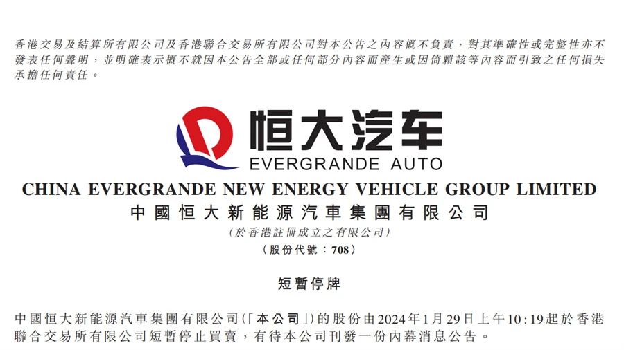 1月29日上午,恒大汽车短暂停牌,后续恒大汽车公告称,有待本公司刊发内幕消息。值得关注的是,就在同一天,香港高等法院就中国恒大公司清盘呈请进行聆讯,法官陈静芬指恒大债务重组方案欠进展,资不抵债,终颁令恒大清盘。