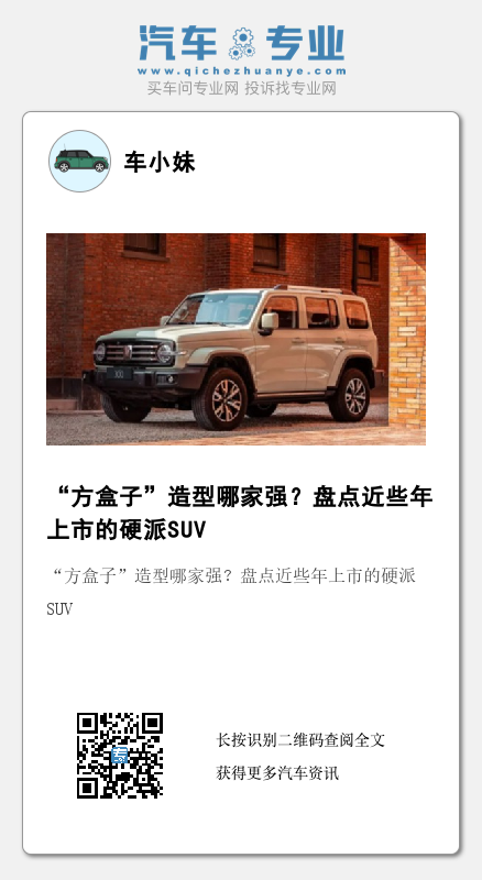 “方盒子”造型的汽车一直以来都受到了不少消费者的青睐,只不过这种车型在几年前售价普遍偏高,比如热度相对较高的奔驰大G、路虎卫士、JEEP牧马人等,自从坦克300(图片|配置|询价)上市并热销后,才有越来越多车企看到了这种车型的市场前景,随后各种“方盒子”造型的车如雨后春笋般涌现出来。