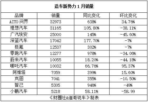 从统计中造车新势力们的销量来看,环比下降是主流趋势,除了AITO问界、阿维塔、哪吒汽车之外,其余车企销量均有所下滑,即便是一直以来异常稳定的极氪和深蓝汽车也出现了小幅度环比下滑,经历了去年年底冲量的它们显然需要一段时间调整状态。