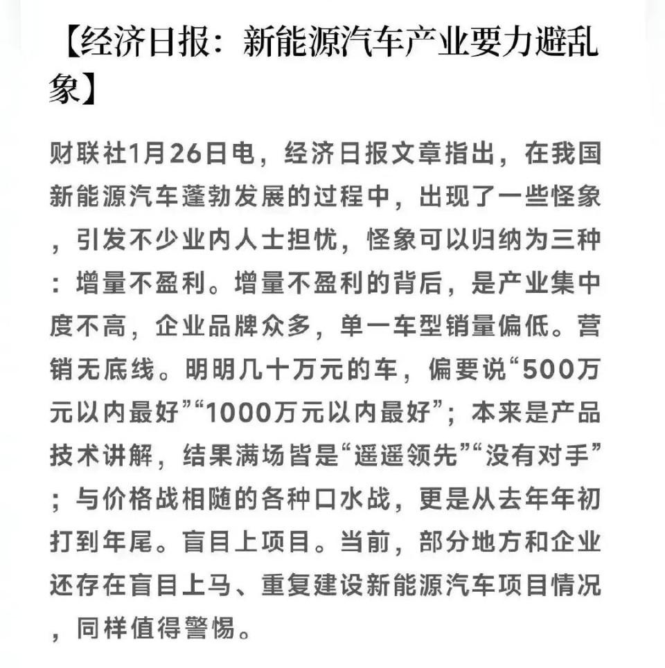 如今新能源车已经进入战国争霸阶段,《经济日报》最近又刊文指出了当前阶段下新能源汽车产业衍生出的新乱象:增量不增利、营销无底线、盲目上项目。