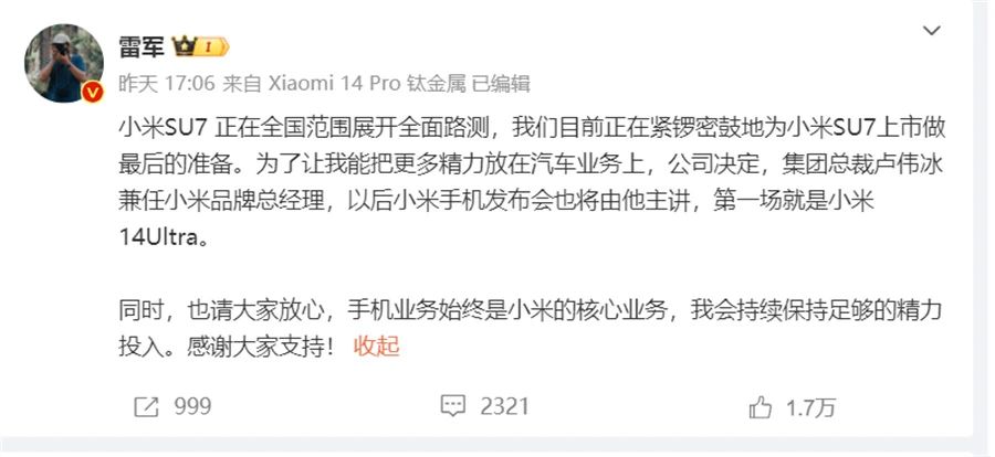 自小米汽车技术发布会后几乎每天在微博上宣传小米SU7的雷军,日前发布了一条有关小米集团人事变动的消息:“为了让我能把更多精力放在汽车业务上,公司决定,集团总裁卢伟冰兼任小米品牌总经理,以后小米手机发布会也将由他主讲,第一场就是小米14Ultra”。