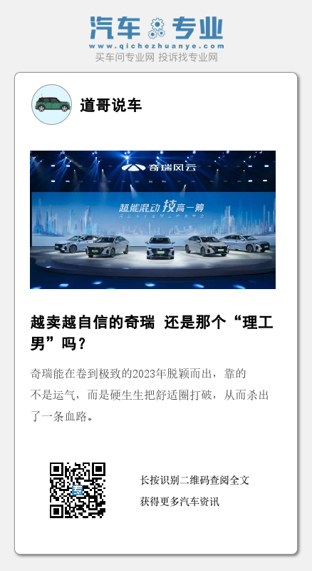 可喜可贺,以“理工男”形象示人的奇瑞,终于在“卷到飞起”的2023年里,学会了积极自我展示。有技术、有品质,就得好好宣传,毕竟酒香也怕巷子深。