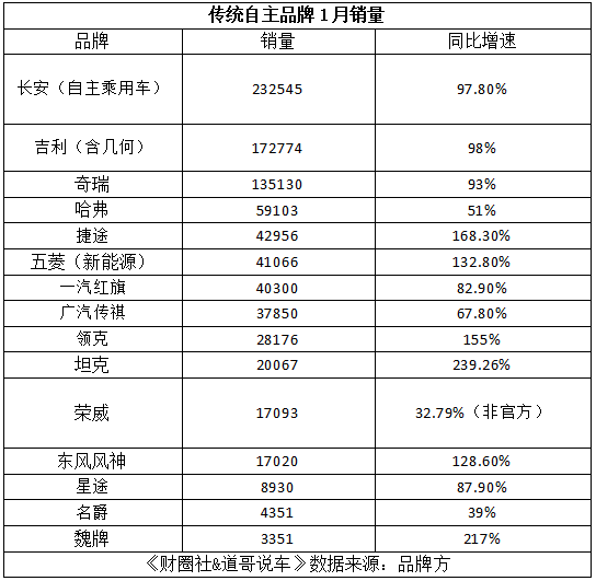 除了它们之外,长城汽车旗下的哈弗品牌也是自主品牌中的经典,不过目前长城汽车方面尚未公布旗下哈弗品牌销量。同时,五菱也是自主品牌中的经典,不过其仅公布了1月新能源销量,超4万的销量以及过百的同比增速也足以令其自傲。从销量上来看,三大经典自主品牌已经成为了市场中的巨无霸,作为对比,目前已公布销量的合资品牌中尚未有1月销量超过10万辆的(南北大众、上汽通用尚未公布)。