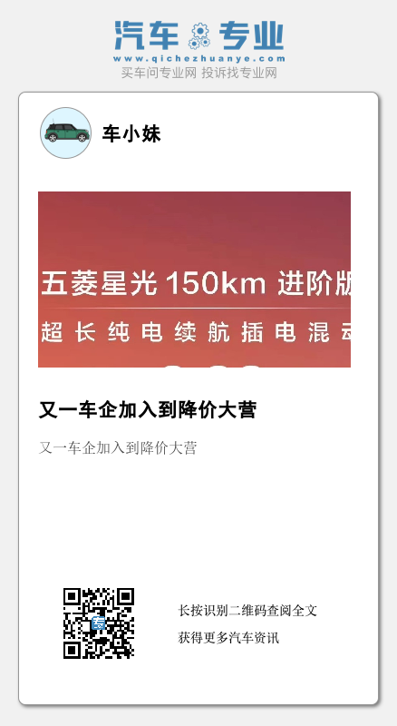 2月19日,五菱汽车官博宣布,五菱星光插混车型150km进阶版售价由10.58万元调整为9.98万元。