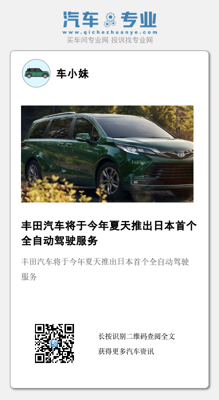 提供服务的车辆将基于丰田Sienna小型货车,并配备使用传感器和人工智能监测道路和周围环境的危险预测系统。它可以在没有司机的情况下完全自主运行,但出于安全原因,该公司计划暂时安排一名司机随车。