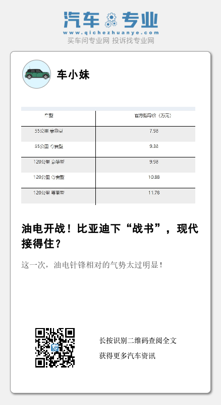 如此一对比,油车之间紧张的“价格战”气氛被烘托得恰到好处,“剑拔弩张”之势呼之欲出。且值得一提的是,这也是以现代为代表的合资车企首次径直对电车的低价打压予以回击。