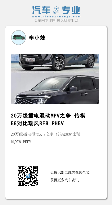 20万元级新能源MPV可选车型并不多,但火药味已经很浓,从上述对比中可看出,这两款车在配置方面相似度很高,尤其是座椅舒适性方面,都很不错。差异化方面,瑞风RF8 PHEV除了尺寸更大,在动力与底盘等硬件上给得更足,很舍得下料。传祺E8在人机交互方面优势明显,虽然绝对空间不如对手,但空间有效利用率更高,同样很实用。从商用角度,瑞风RF8 PHEV大空间更舒适,更适合专业司机接送客户。从家用角度看,大尺寸车在停车、狭窄空间使用的机动性较差,传祺E8尺寸小反而更好开。不同用户可根据自己的实际需求去选择。