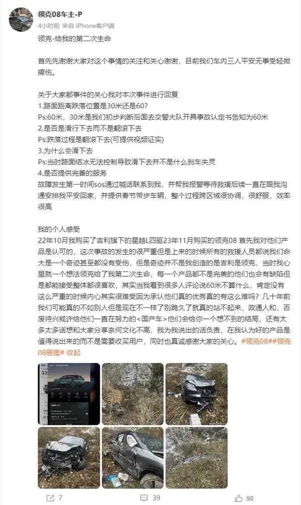 说句公道话,看到领克08 EM-P这般强悍安全表现后,那些鼓吹冰箱、彩电和沙发的车企作何感想呢?有人说智能化就是汽车市场决赛入场券,我不这么看。毕竟,安全才是汽车的灵魂和根本。抛开安全谈智能,就是耍流氓。一款车是否遥遥领先,不是它多智能,而应该是它在用户的安全守护方面多有诚意。从60米高的悬崖跌落,车辆A柱、B柱、C柱完好,两侧安全气囊和气帘也都及时打开,而且车内人员全部通过物理门把手打开车门,第一时间完成逃生。更重要的是,车主魏先生及2位家人仅有小的擦伤,未有其他健康问题。就这,除了要给领克点一个大大的赞,也非常自豪的说,领克就是咱们中国的沃尔沃。