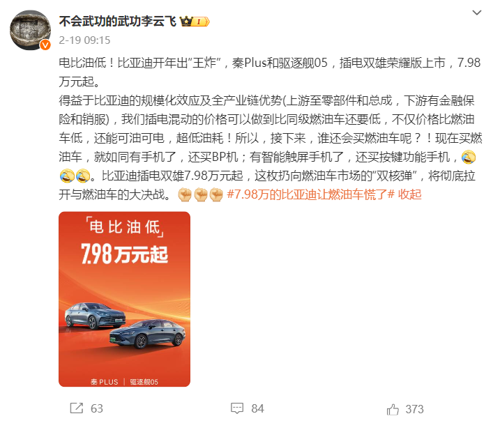 在产能充足、需求放缓的大背景下,要稳住增长,势必得抢夺他人的蛋糕。比亚迪集团品牌及公关处总经理李云飞在社交媒体直接宣战:“比亚迪插电双雄7.98万起,这枚扔向燃油车市场的‘双核弹’,将彻底拉开与燃油车的大决战。”有网友称,眼下的战况堪比“秦扫六合”,合指的是合资车。