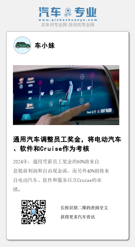 2024年,通用受薪员工奖金的60%将来自息税前利润和自由现金流,而另外40%则将来自电动汽车、软件和服务以及Cruise的业绩。