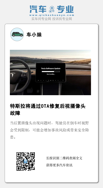 当后置摄像头出现问题时,驾驶员在倒车时视野会受到限制,可能会增加事故风险或带来安全隐患,这也是特斯拉公司启动本次召回的原因。