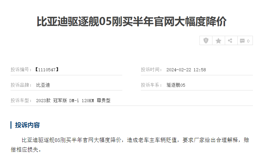 而对于各位刚提车的老车主而言,还没享受几天就遭受“背刺”,这谁能忍?所以,近期降价的热门车型都登上了各大网站的投诉榜单,投诉内容大致相似,基本都是吐槽刚提车就大幅降价造车车辆迅速贬值,老车主成“韭菜,希望厂家能做出解释并赔偿相应损失”。