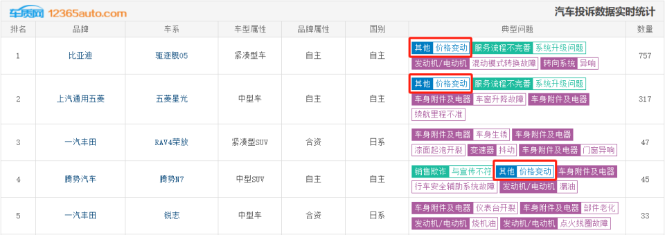 以车质网近七日的投诉内容为例,驱逐舰05、五菱星光不到一周时间内,投诉量就分别达到了757条和317条,与之类似的还有腾势N7,前不久也传出综合优惠6.5万元的消息。而值得一提的是,整个一月份投诉量最多的车型也还不到600条,这也足见老车主们对于突如其来的降价事件有多么的不满。