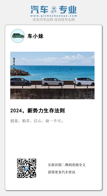 逐字逐句间,俨然感受到了他的愤怒与失望。可望向忠告背后,还是能够感受到哪吒遇到了比较棘手的麻烦。而2024年,怎样保证终端消费者“信心”的充沛,已经成为抛给所有新势力造车的一道必答题。