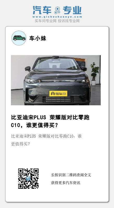 最后总结一下,不谈内外设计这类比较主观的方面,零跑C10在配置上尤其是安全配置、驾驶辅助功能方面更有优势,混动车型的纯电续航里程更高,再加上相对低一些的价格,表现出不俗的竞争力。而宋PLUS荣耀版在配置上的优势是多了电动后备厢、后排座椅比例放倒、后视镜锁车自动折叠、座椅加热通风等“看得见”的功能,另外纯电版本的续航更长,能满足有相应需求的消费者。