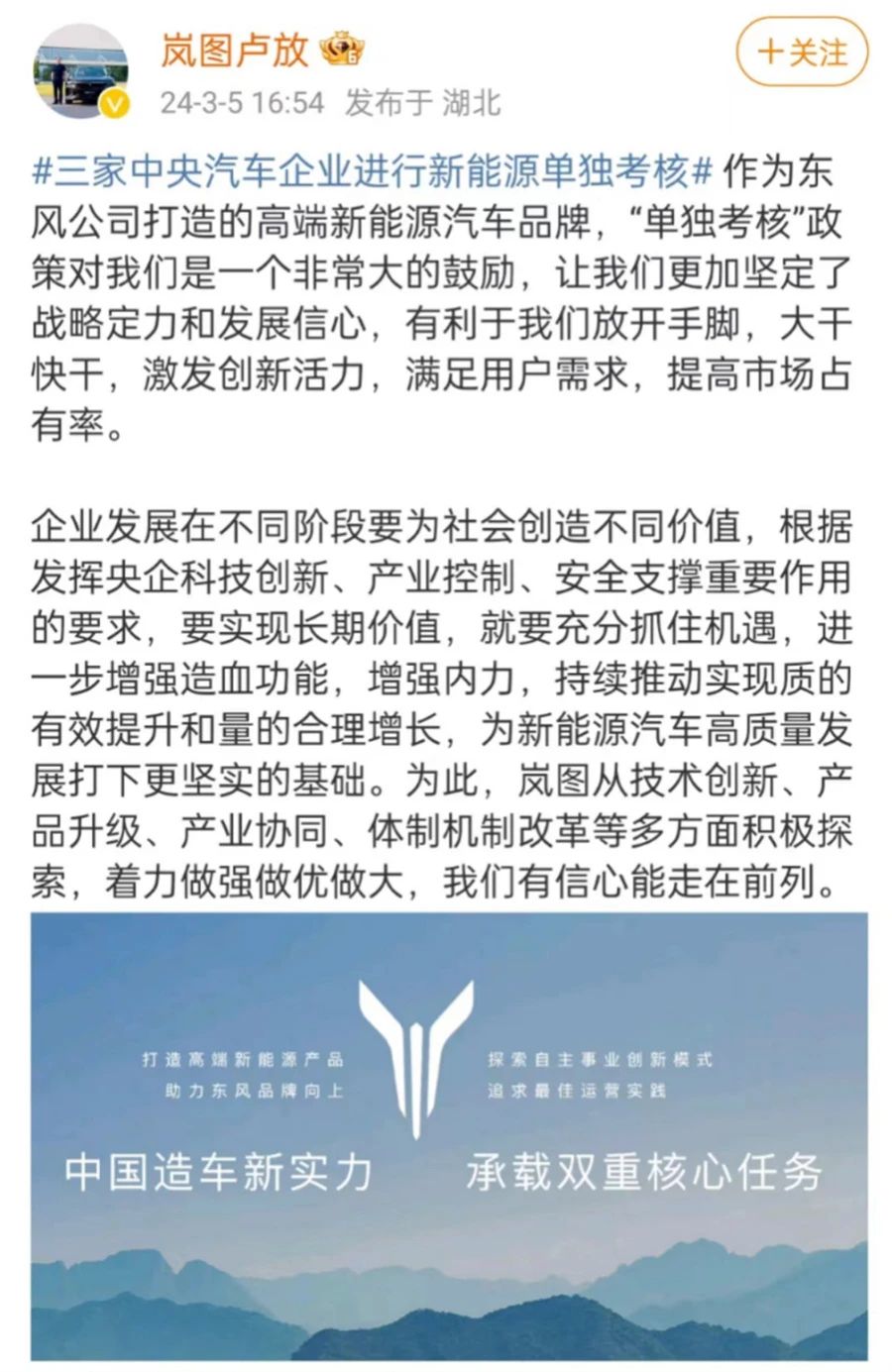 对此,处于漩涡中心的三家车企都纷纷及时作出了回应。中国一汽高层对外回应“必须努力完成”,东风集团内部人士表示“确实有必要(进行调整)”,东风旗下高端新能源品牌岚图汽车CEO卢放更是直接在微博大表决心,直言“‘单独考核’政策对我们是一个非常大的鼓励,让我们更加坚定了战略定力和发展信心,有利于我们放开手脚,大干快干。”