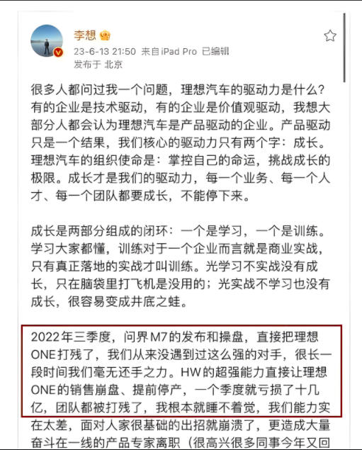 李想对问界是抱着担忧的态度,因为面对问界,理想汽车并没有“还手之力”。2023年6月,李想微博上说,“2022年三季度,问界M7的发布和操盘,直接把理想ONE打残了,我们从来没遇到过这么强的对手,很长一段时间我们毫无还手之力。”