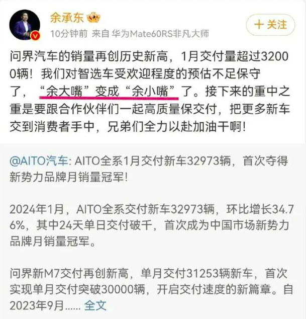 余承东忍不住内心的喜悦,发文称“高质量保交付,把更多新车交到消费者手中,兄弟们加油干!”。