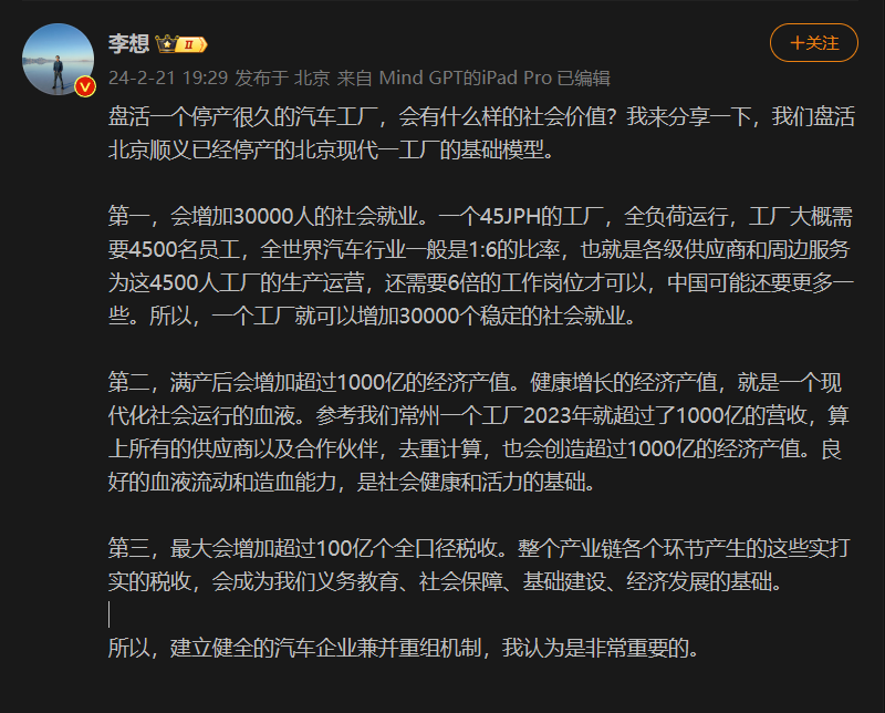 另一方面,资源被回收利用的车企,也算是以另一种形态继续参与行业建设。就像李想自己说的,理想汽车重新盘活了停产的北京现代工厂,贡献了不小的社会价值。