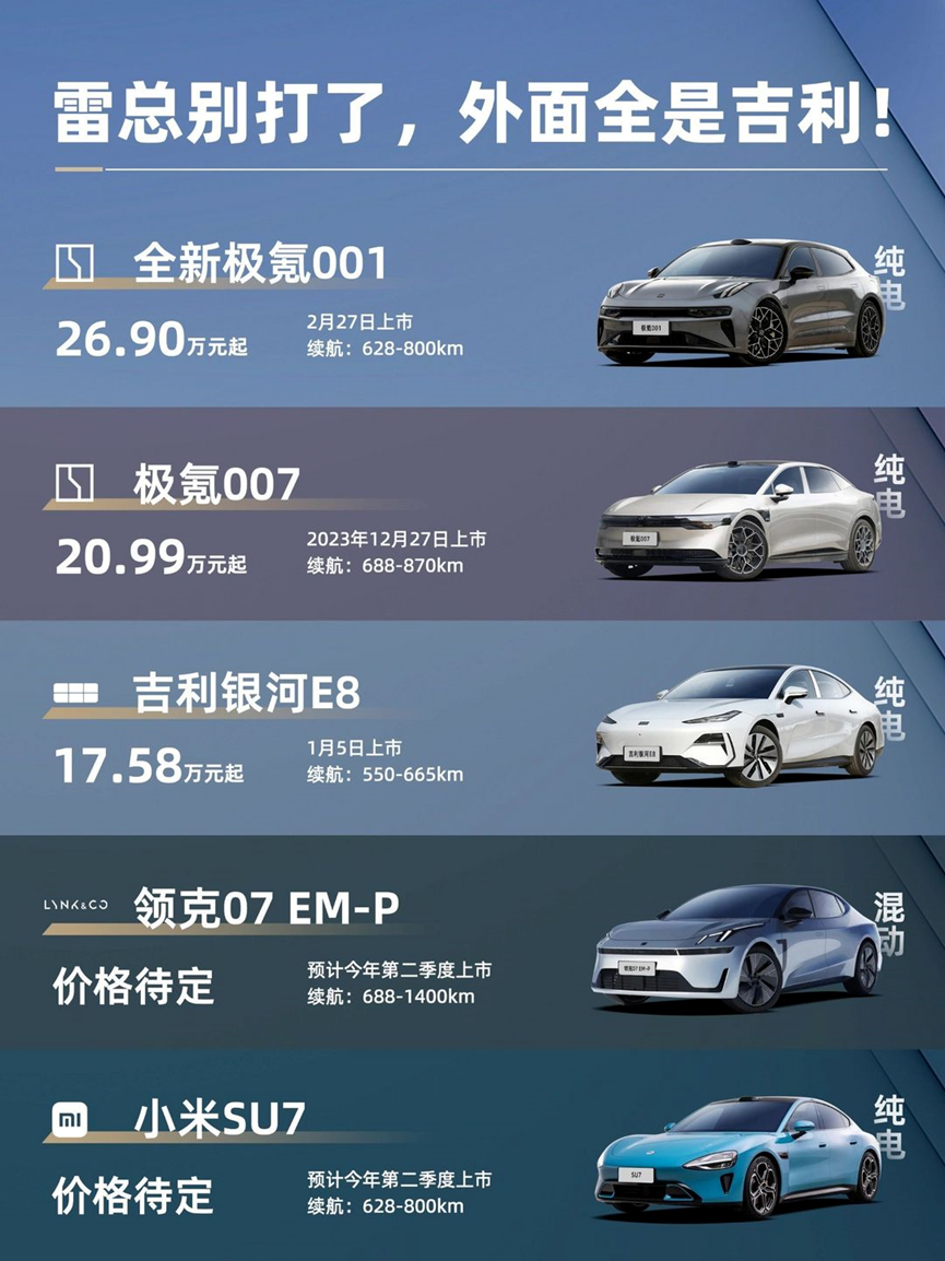 刚上市的银河E8和极氪007、降价增配的极氪001、后面还有插混领克07 EM-P……几乎覆盖了小米SU7的价格区间。网友也调侃道:“雷总别打了,外面全是吉利!”