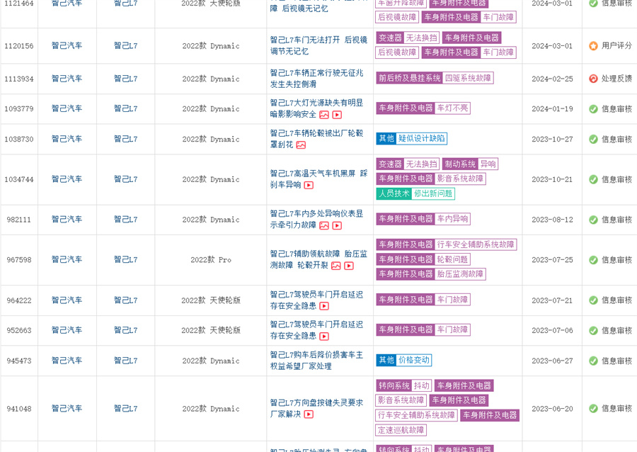 其中原因,从第三方汽车投诉平台车质网中也可窥见一二。据车质网投诉信息,智己L7存在后视镜调节无记忆、门窗调节失灵、正常行驶无征兆发生失控侧滑、胎压监测失灵、异响等众多投诉。对于一款当时售价在30万-60万区间的豪华车而言,这些故障真的应该存在吗?