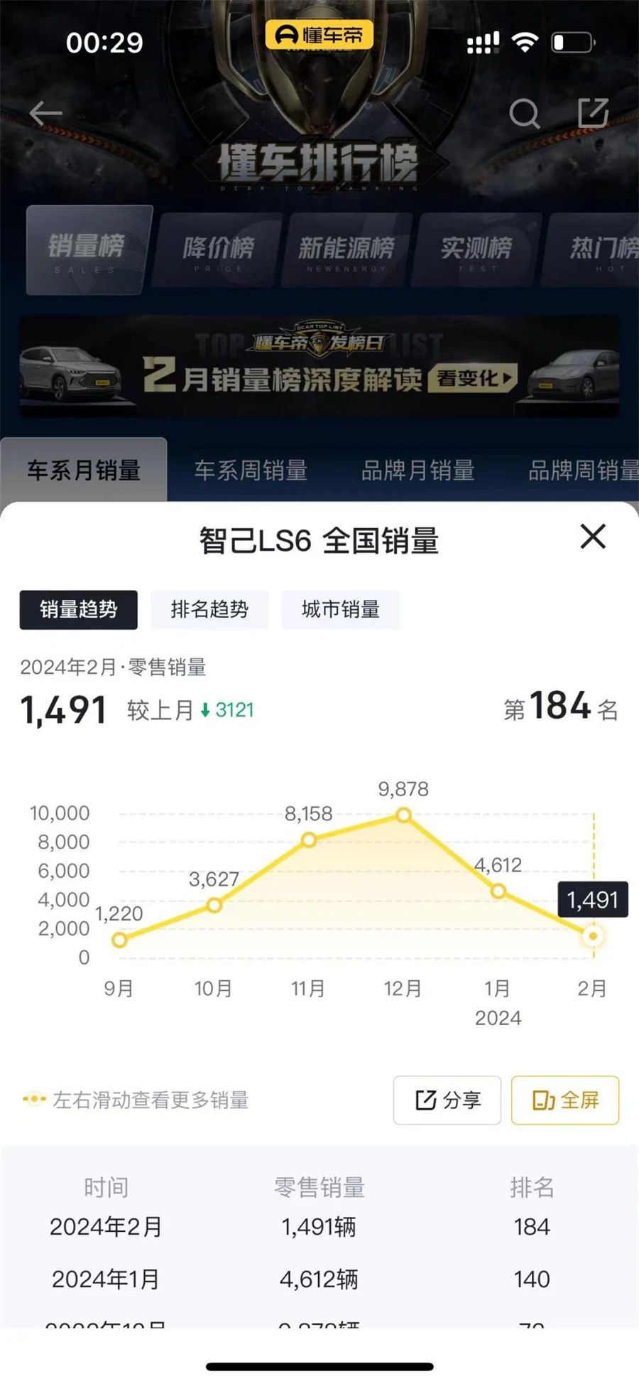 只不过,目前来看,智己LS6的高光时期似乎很短。据懂车帝销量排行榜,智己LS6在2023年11月销量已达8156辆,12月更逼近万辆大关达到了9878辆,然而2024年开始,这款车销量骤然下滑,1月销量4612辆,2月销量1491辆。