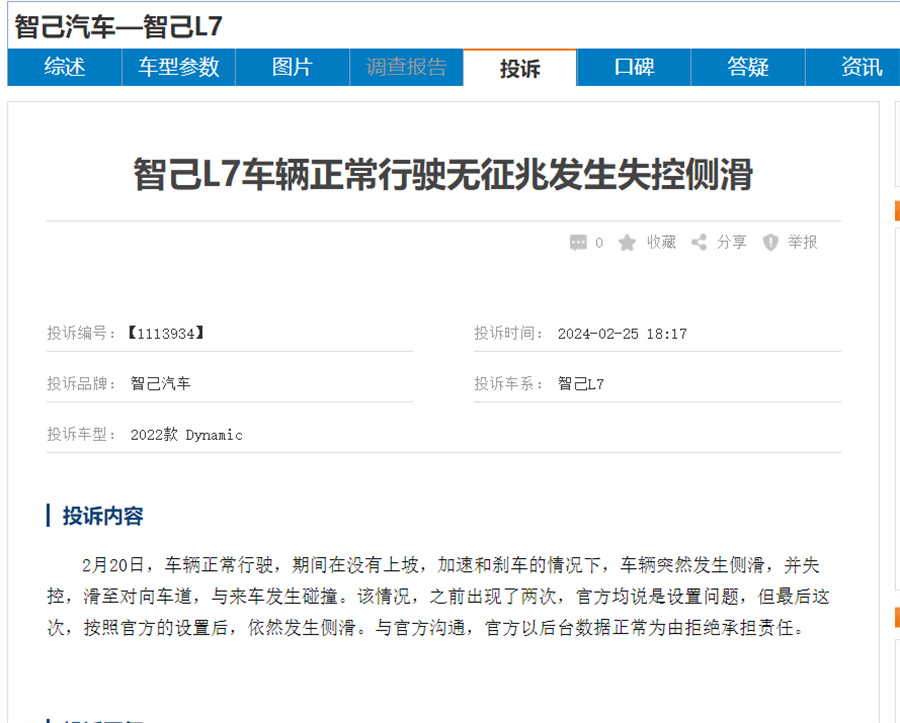 其中,“正常行驶无征兆发生失控侧滑”更是给车主带来了安全风险。据一位2022款智己L7 Dynamic车主在投诉中表示:“2月20日,车辆正常行驶,期间在没有上坡车,加速和刹车的情况下,车辆突然发生侧滑,并失控,滑至对向车道,与来车发生碰撞。该情况,之前出现了两次,官方均说是设置问题,但最后这次,按照官方的设置后,依然发生侧滑。与官方沟通,官方以后台数据正常为由拒绝承担责任”。