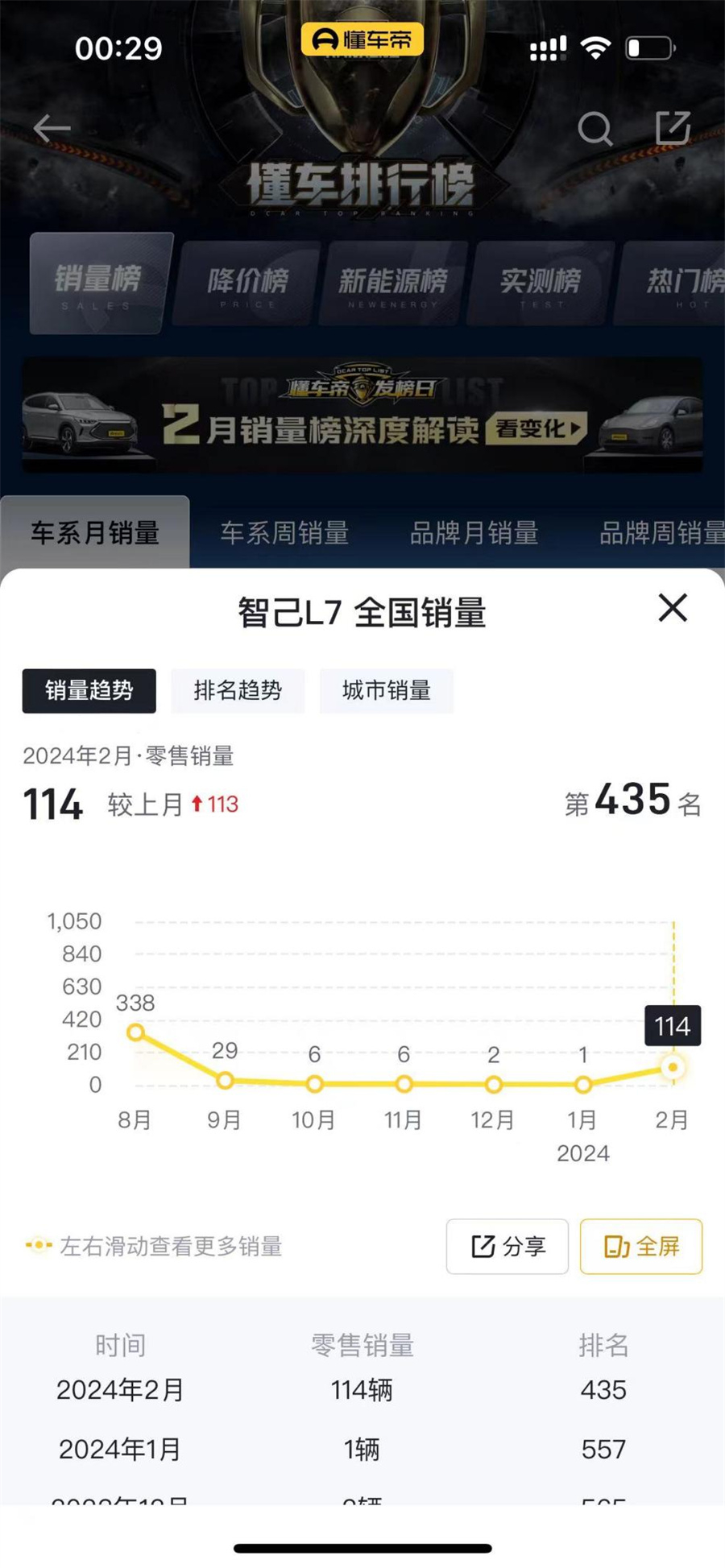 作为智己汽车首款产品,智己L7的销量表现始终很难令人满意,尤其是在智己LS7、智己LS6先后成为品牌顶梁柱后,智己L7的销量更是落寞,据懂车帝销量排行榜,这款车从2023年10月到2024年1月,连续四个月销量为个位数。
