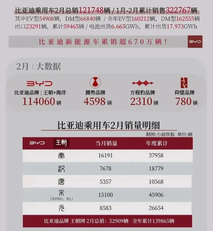 其次是在中低端市场,吉利、长安、五菱等车企的销量大涨,2024年1月,比亚迪的月销量被吉利反超。2024年2月,比亚迪销量122311辆,较去年同期193655辆同比下降36.8%。