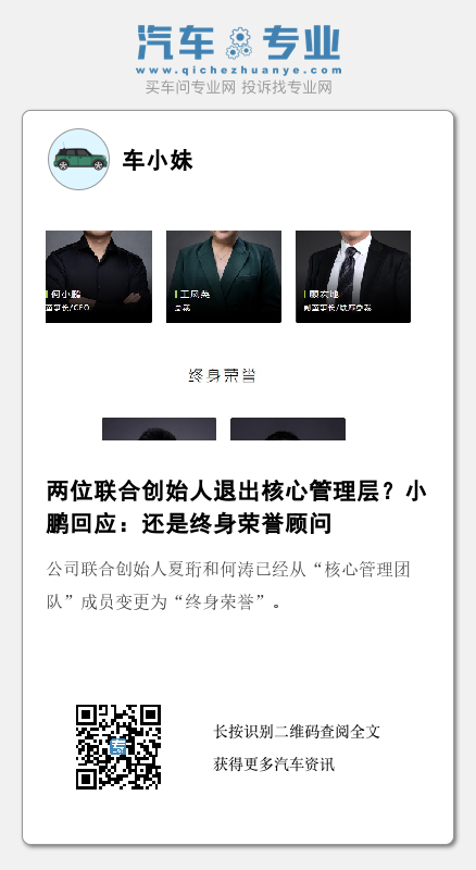 据小鹏汽车官网中“团队成员信息”一栏显示,公司联合创始人夏珩和何涛已经从“核心管理团队”成员变更为“终身荣誉”。目前,小鹏汽车“核心团队成员”为董事长/CEO何小鹏、总裁王凤英和副董事长/联席总裁顾宏地。