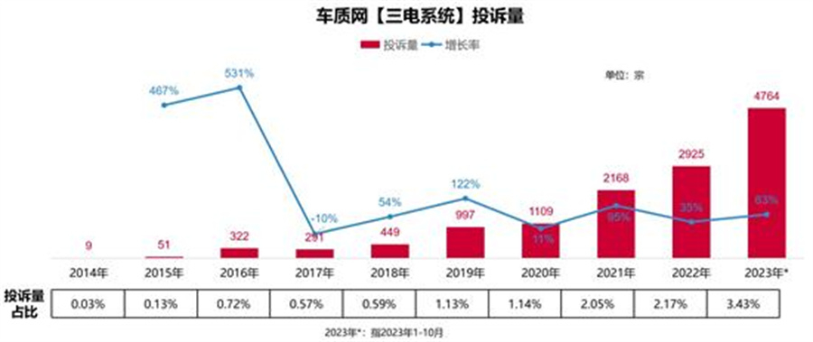 要知道,车质网发布的2023年度国内新能源车投诉分析报告显示,新能源车累计投诉量超过5万宗,同比上涨148.3%。从投诉占比情况来看,占年度投诉总量的30.1%。