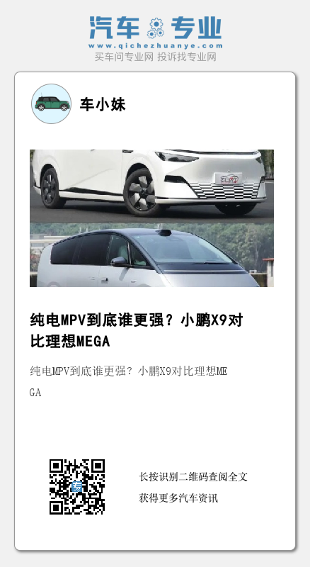同样是纯电MPV,小鹏X9与理想MEGA的产品力都很强,两者都提供功能丰富的航空座椅,有很好的车机与智能驾驶,空间都够大够实用。不同点是,小鹏X9在后排座椅使用时尾厢容积较小,中排航空座椅要选装,大部分车型是单电机驱动,底盘没有CDC减振器但多了后轮转向;理想MEGA座椅的功能与豪华性都高很多,超大空间充分考虑到多人乘坐的舒适性,可以完成6人长途旅行,有CDC减振器底盘约束性更高,但没有后轮转向转弯半径比较大。总体而言,小鹏X9的定价合理,产品力适中,销量会更稳定,而理想MEGA价格偏高,后期推出低配车型降低门槛才能逐渐上量。