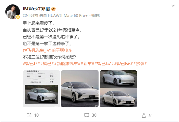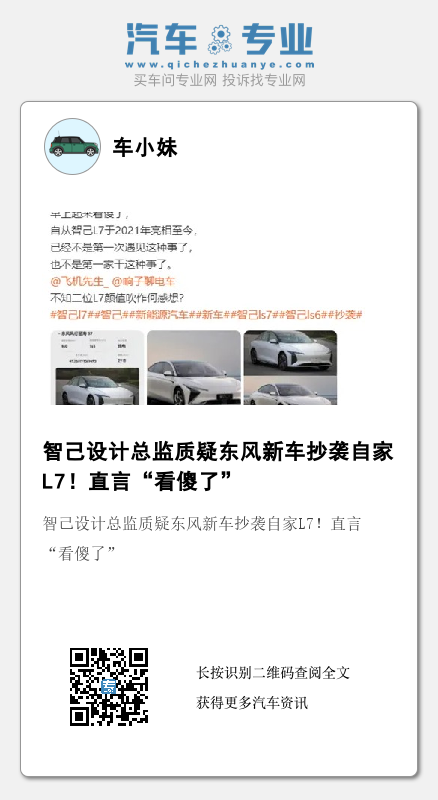 近日,智己汽车设计总监许邓韬在微博发文质疑东风风行星海S7造型涉嫌抄袭自家L7,并表示自从智己L7于2021年亮相至今,已经不是第一次遇到外观设计被抄袭的事情,其直言称“早上起来看傻了。”