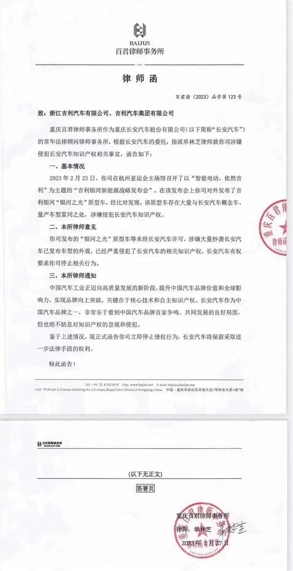 据了解,去年初,吉利发布了“银河之光”概念车,随后长安方面表示,这款原型车存在大量与长安汽车概念车、量产车雷同之初,涉嫌侵犯长安知识产权。长安汽车因此要求吉利停止相关行为,因此发送律师函,同时长安保留采取进一步法律手段的权利。