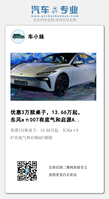 所以我们可以看到,15万左右价格区间的电动车是特别卷的,除了可以选零跑C01顶配625尊贵版,在长安推出了真香版之后,你还能买到续航更长的启源A07 710旗舰版车型。当大家都以为卖15.99万的启源A07是真香的时候,没想到又来了一个掀桌子的选手:东风奕派eπ007。