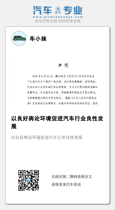 无独有偶。3月13日,长城汽车回应“员工离职”文章:恶意揣测,将提起诉讼。早在去年11月,长城汽车董事长魏建军就曾公开表示,“莫须有的那些东西,非常没底线,非常肮脏,网络水军真能用这个舆论带节奏。”