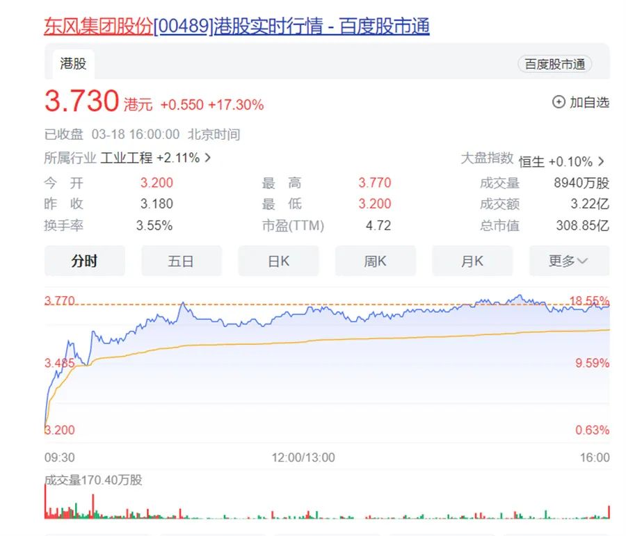 【文/财圈社&道哥说车 麻建宇】3月18日,整车相关企业股价普遍上涨。A股方面,东风汽车、江淮汽车涨停,赛力斯股价创下历史新高;港股方面,东风集团股份大涨超过17%,北京汽车、吉利汽车、蔚来等也跟涨。