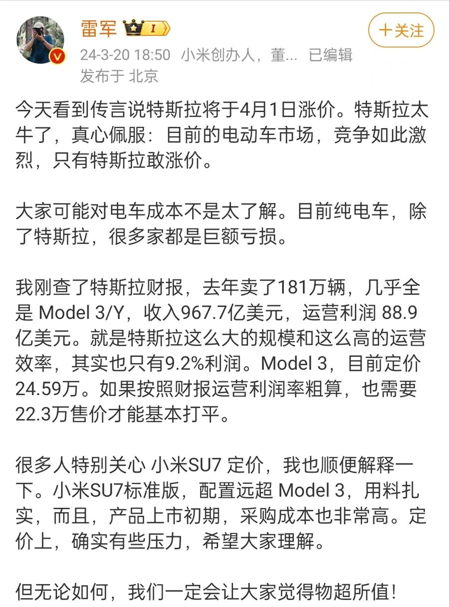 此前雷军在微博发文解释,“小米SU7标准版,配置远超Model 3,用料扎实,而且产品上市初期,采购成本非常高,定价上确实有些压力,希望大家理解。”字里行间似乎在暗示SU7的身价不菲。不过,雷军也曾经在接受采访的时候说过,品牌溢价是小米最恨的一个词。