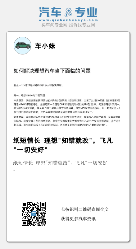 李想强调,“2024年3月的问题,是我们2022年问题的加强版。实事求是,知错就改,我们有信心在共同的努力下,聚焦用户价值,聚焦经营效率,耐心控制节奏,通过脚踏实地的解决问题,长期健康的服务好我们的用户。”
