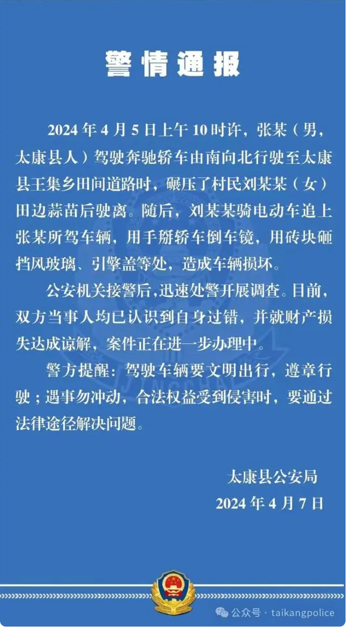 大皖新闻讯 河南省太康县公安局日前发布警情通报:4月5日上午10时许,张某驾驶奔驰轿车由南向北行驶至太康县王集乡田间道路时,碾压了村民刘某某田边蒜苗后驶离。随后,刘某某骑电动车追上张某所驾车辆,用手掰轿车倒车镜,用砖块挡风玻璃、引擎盖等处,造成车辆损坏。公安机关接警后,迅速处警开展调查。目前,双方当事人均已认识到自身过错,并就财产损失达成谅解,案件正在进一步办理中。