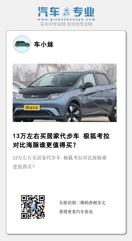 小结:对比两车不难发现,极狐考拉拥有更大的空间、更好的车机智能体验以及更长的续航能力。对于家用出行,极狐考拉更具吸引力。比亚迪海豚则在动力方面占据优势,不过这也牺牲了其续航能力。总体来看,考拉主打居家生活,而海豚则偏向日常上下班代步。两车在产品力和体验上的差异还是很明显的,而且4S店的优惠力度也不同。建议车友们去4S店都试驾一下,就很清楚哪台车更适合自己的用车需求了。