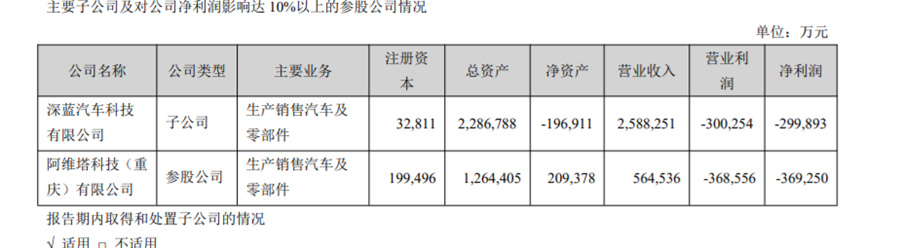 值得一提的是,此次年报中,长安汽车披露了深蓝汽车和阿维塔两个新能源子公司的财务状况,无一例外均处于亏损状态。当然,这也无可厚非,毕竟行业内的新能源车企中,盈利的并不多见,何况两家子公司还处于发展初期。