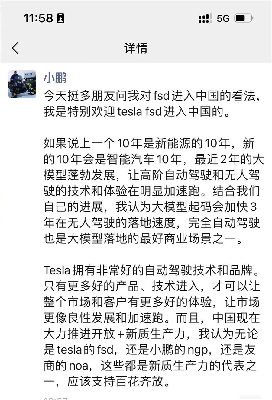 但事实或许并不是这样。4月29日下午,小鹏汽车董事长何小鹏就FSD入华发表了看法:“今天挺多朋友问我对FSD进入中国的看法,我是特别欢迎Tesla FSD进入中国的。”何小鹏称,Tesla拥有非常好的自动驾驶技术和品牌。只有更多好的产品、技术进入,才可以让整个市场和客户有更多好的体验,让市场更向良性发展并加速跑。